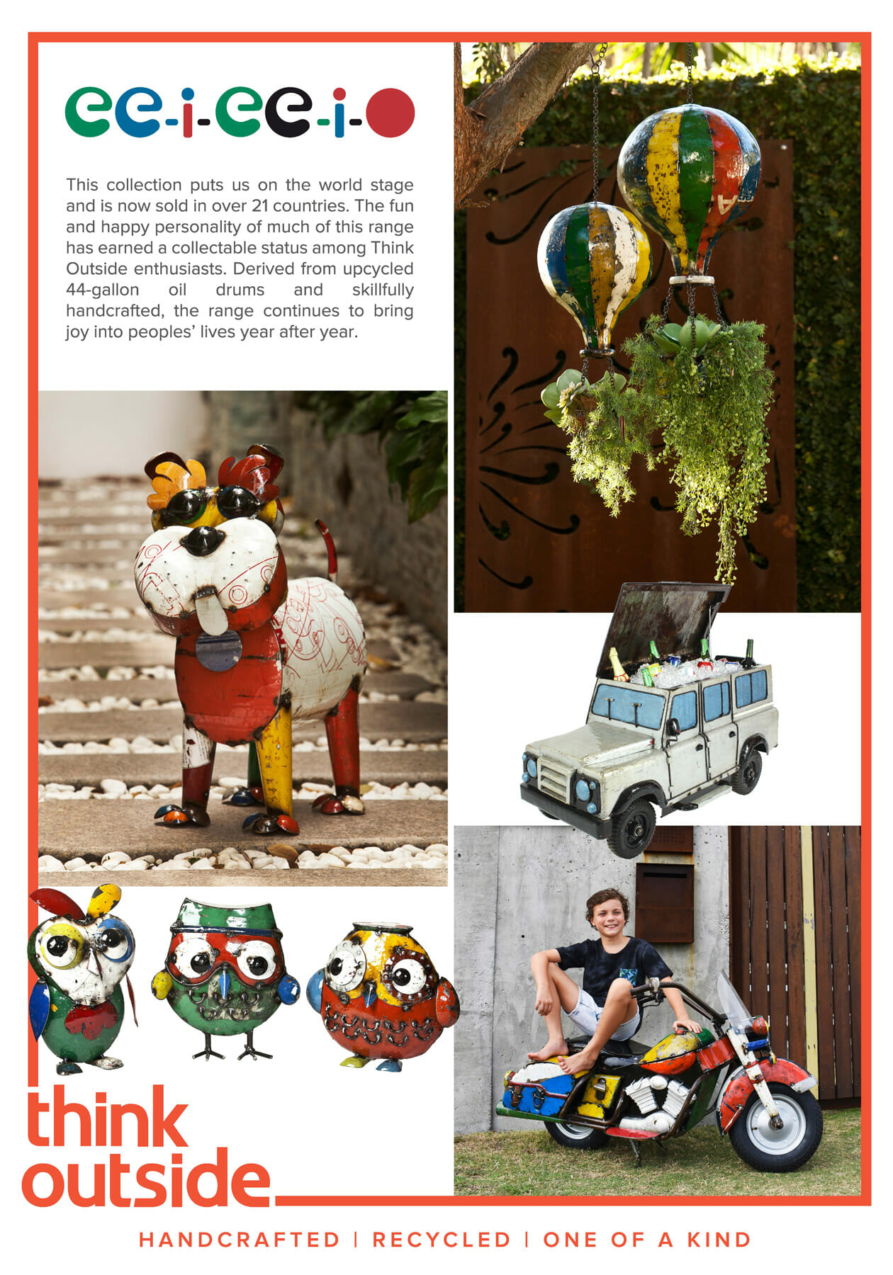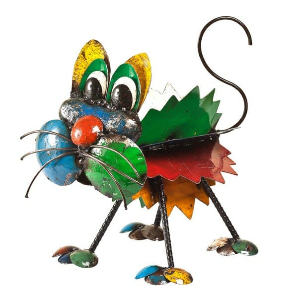 Cute smiling cat made from recycled 10-gallon painted drums by Think Outside.