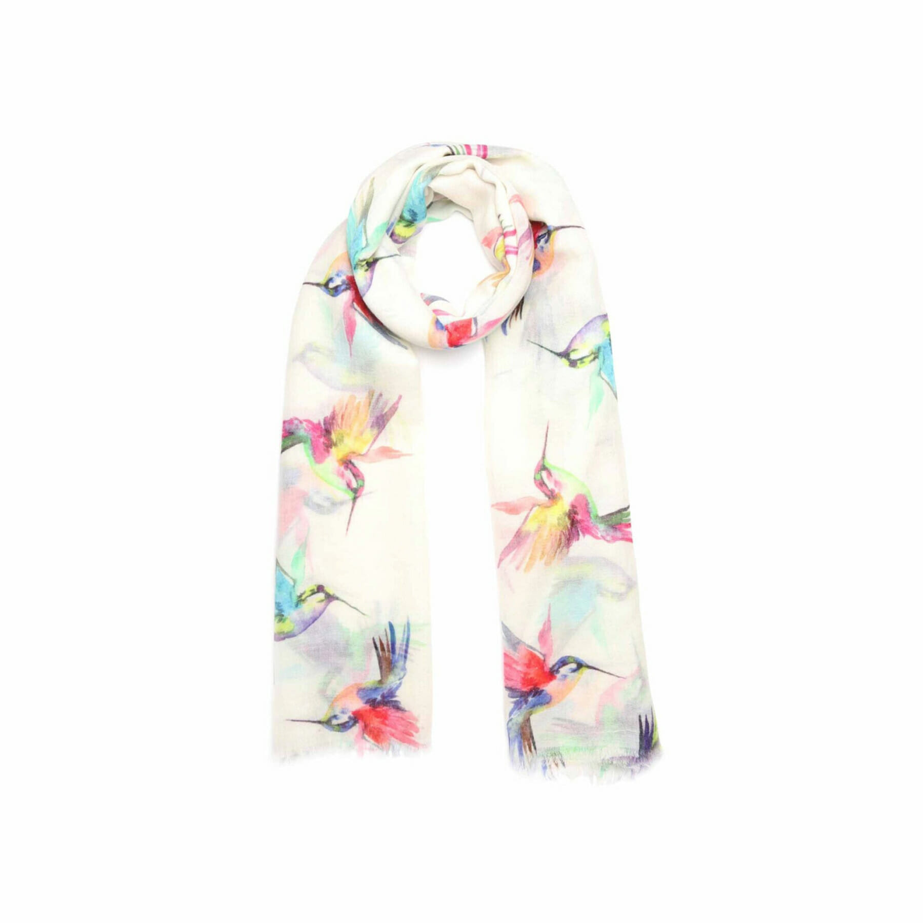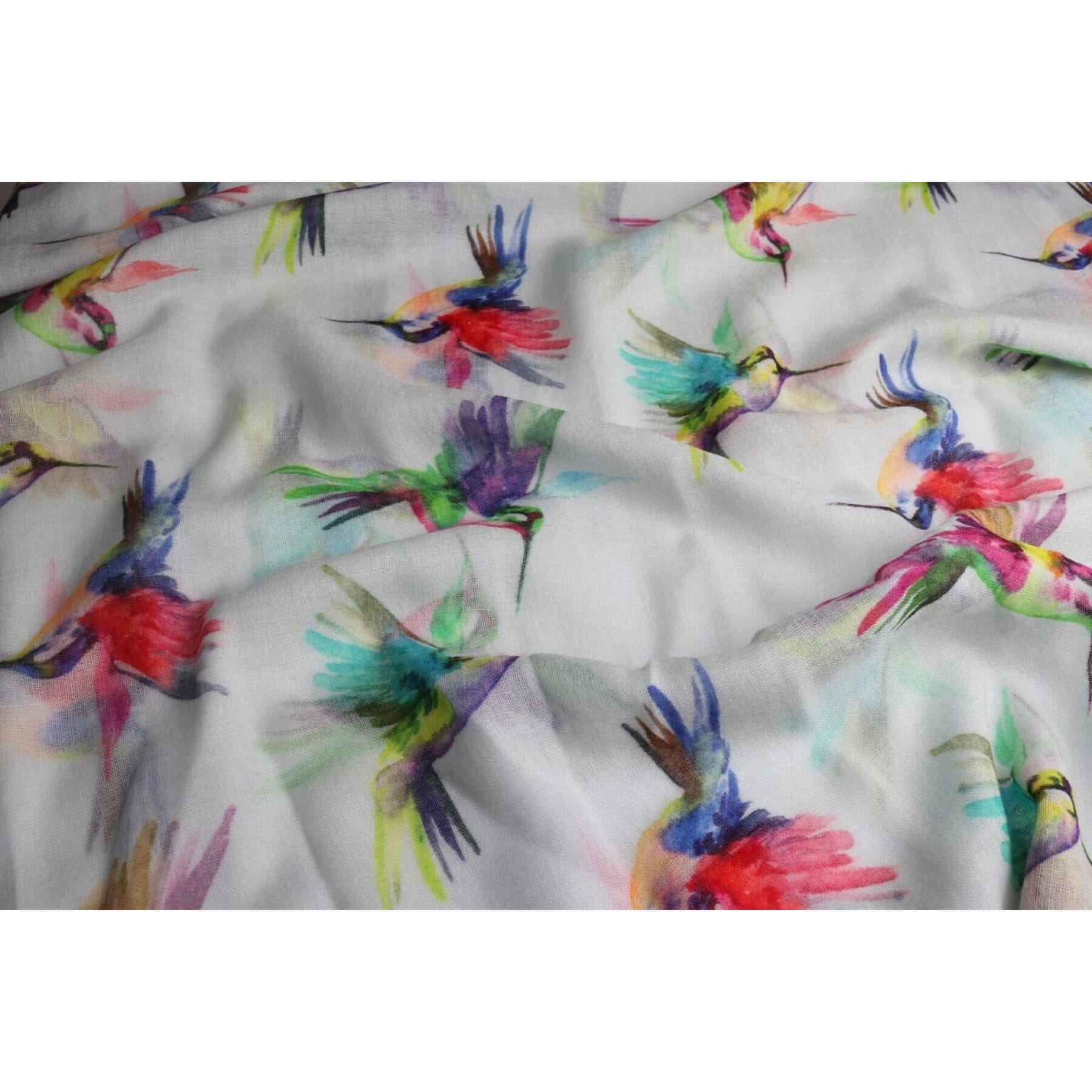 Colourful humming birds grace this soft white scarf made from the finest merino wool (90%)/silk (10%) mix, and generously sized at 55x180cm